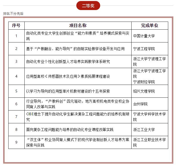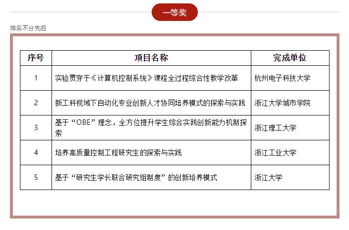 浙江省自动化学会高等教育教学成果奖评审工作于2019年5月26日结束,经专家评审委员会评审,我院由潘海鹏,顾敏明,高金凤,任佳,雷美珍老师负责的项目——基于“OBE”理念,全方位提升学生综合实践创新能力机制探索,荣获2019年浙江省自动化学会高等教育教学成果奖一等奖!