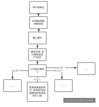 本设计提出了一种数字图片识别系统的方案。由MATLAB端输入一张带有数字的图片,使用通过MNISIT训练集经由神经网络训练出的模型识别带有数字的图片,并将识别的结果通过串口发送到STM32,并通过液晶显示屏LCD实时显示,不同数字实现对STM32不同的控制作用,具体的控制流程图如下图所示。