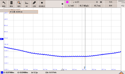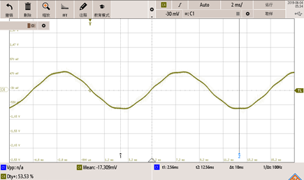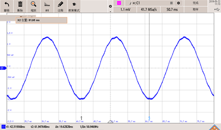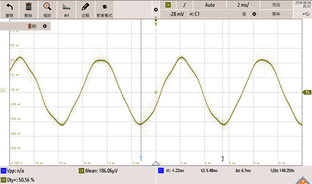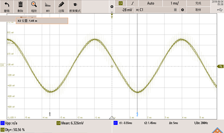 电路上电后,接示波器观察其输出电压的波形,如图5-11所示,可以看出输出电压具有良好的正弦波波形。调整示波器的时间轴,观察输出波形的局部图像,如图5-12所示。可以观察到细小的开关通断产生的尖峰脉冲。