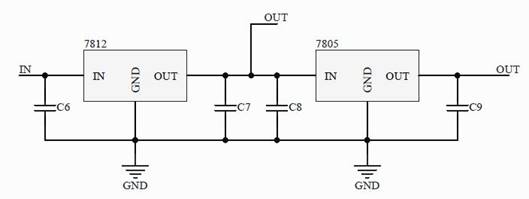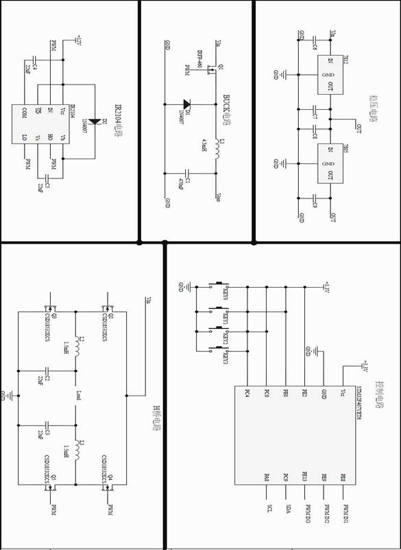 LM7812、LM7805三端稳压集成电路IC芯片元器件,适用于各种电源稳压电路,输出稳定性好、使用方便、输出过流、过热自动保护。电路中STM32需要5V供电、OLED需要5V供电、IR2104半桥驱动需要12V供电,需在电路中构建如图3-5的稳压电路供电。
