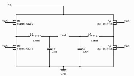 H桥主电路搭建如图3-2所示,MOSFET型号选用为CSD18532KSC,为大功率MOS管。输出滤波电感选为1.5mH,电容选型为金属化聚丙烯膜电容器,容值为22uF。