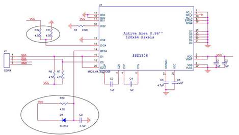 0.96寸OLED模块原理图如图3-4所示。其外扩引脚CON4,引脚1为GND引脚,使用时接地,引脚2为Vcc引脚,使用时接+5V电源。该OLED模块使用I2C方式通讯,引脚3、4分别为SCL、SDA引脚,与STM32的I/O口相连,实现通讯的功能。
