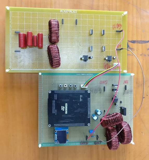 H桥逆变电路的输出电压在没有滤波之前与STM32输出口的波形相似,只是幅值的变大。为了得到目标的正弦电压波形,在H桥的输出端加了大电容、大电感滤波。另外在调频的过程中,频率升高后,交流电压的输出峰峰值在变小。分析是开关频率增大后,电感的储能时间减小,LC滤波环节的效果更明显,导致输出电压的峰峰值减少。
