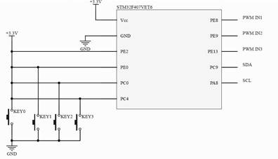 STM32F4是由ST(意法半导体)开发的一种高性能微控制器。其采用了90 纳米的NVM 工艺和ART(自适应实时存储加速器)。根据前面硬件电路的控制需求,配置相关的引脚如图3-5所示。在应用中,所有元器件引脚必须共地才能正常工作。