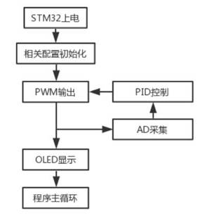 如图4-1为主程序的框图。STM32上电后,进行定时器、I2C通讯、按键引脚初始化等配置,最后进入程序主循环。