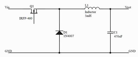 BUCK电路搭建如图3-1所示,MOSFET型号选用为IRFP-460,耐压值较大。电感L1感值为5mH,输出滤波电容容值为470uF,续流二极管型号为1N4007。BUCK电路的带载能力与开关管频率、电容值、电感值有关。