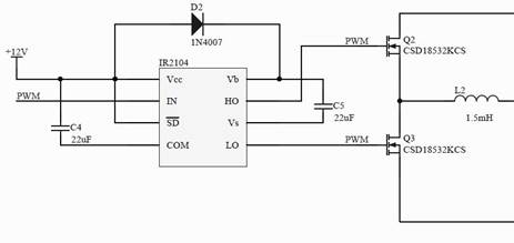 STM32串口输出的PWM波不能直接控制开关管的开通与关断,需要加上驱动电路放大PWM波信号,以保证其驱动的能力。选用IR2104驱动芯片,芯片有使能端口和自带死区,可以避免短路的情况发生。